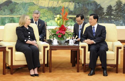 Hu Jintao, the chariman of China, meets Clinton, America Secretary of State, in Great Hall of People.