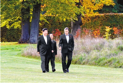 當天下午,習近平抵達契克斯鄉間別墅時(shí),卡梅倫在下車(chē)處熱情迎接。兩國領(lǐng)導人一同前往別墅草坪,共同種下象征中英友誼的橡樹(shù)。兩國領(lǐng)導人漫步草坪,邊走邊談?穫愒俅螣崃覛g迎習近平主席對英國進(jìn)行國事訪(fǎng)問(wèn)。習近平表示,我這次訪(fǎng)英十分成功,成果豐富。我對中英關(guān)系開(kāi)創(chuàng )“黃金時(shí)代”充滿(mǎn)信心。