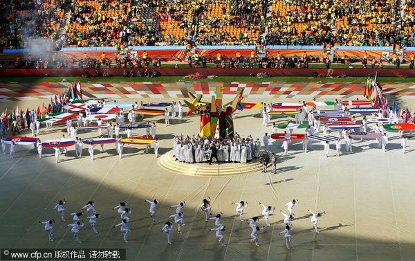 北京時(shí)間6月11日晚20點(diǎn),2010年南非世界杯開(kāi)幕式在約翰內斯堡的足球城體育場(chǎng)隆重上演。聲勢浩大的嗚嗚賽啦、鮮艷的色彩……極具非洲特色的開(kāi)幕式,為歷時(shí)一個(gè)月、萬(wàn)眾矚目的世界杯大賽做了一場(chǎng)精彩的開(kāi)場(chǎng)秀。