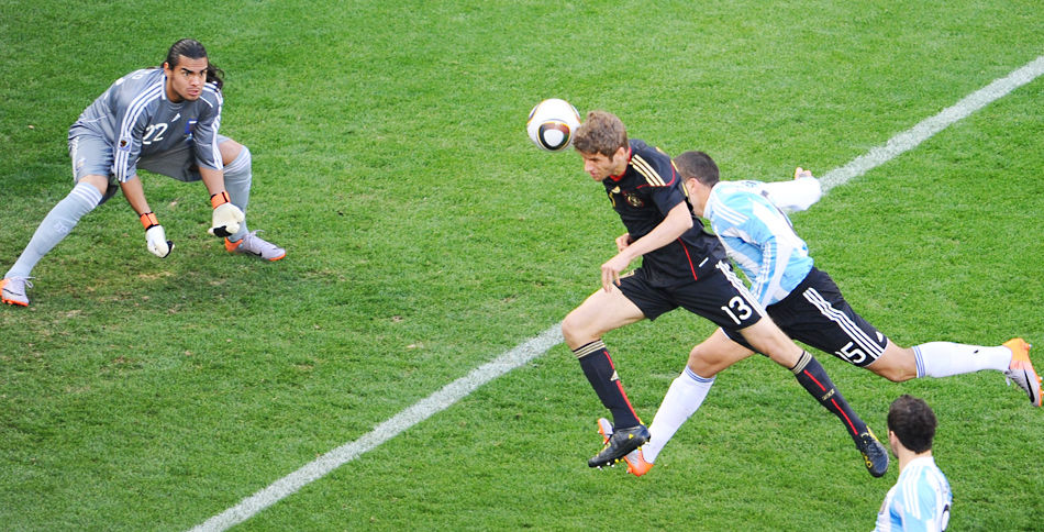 北京時(shí)間7月3日22點(diǎn),第19屆南非世界杯展開(kāi)第三場(chǎng)1/4決賽爭奪。在開(kāi)普敦綠點(diǎn)球場(chǎng),德國隊4-0橫掃阿根廷隊成為第三支闖入四強的球隊,連續三屆殺入世界杯半決賽,此役德國隊創(chuàng )造兩隊交戰史最懸殊勝局紀錄,阿根廷隊則遭遇世界杯上近36年來(lái)最慘痛失利。開(kāi)場(chǎng)僅157秒,穆勒接施魏因斯泰格開(kāi)出的任意球頭球破門(mén)打入德國隊在世界杯決賽圈的總第200粒進(jìn)球;克洛澤梅開(kāi)二度個(gè)人世界杯總進(jìn)球數達到14粒,距離紀錄保持者羅納爾多僅有1粒差距;另外A-弗雷德里希也在此役取得國家隊處子球。