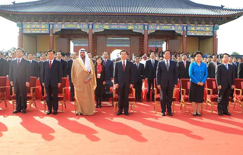 10月12日,中共中央總書(shū)記、國家主席胡錦濤等中央領(lǐng)導同志在北京天壇出席第16屆亞運會(huì )火炬點(diǎn)燃暨火炬傳遞啟動(dòng)儀式。新華社記者 樊如鈞 攝