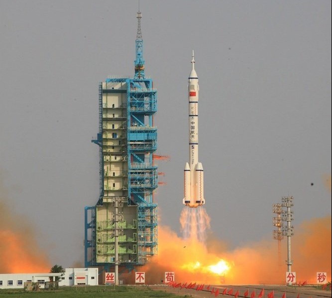 托舉神九飛船的長(cháng)征二號F遙九火箭,從酒泉衛星發(fā)射中心騰空而起。這是長(cháng)征火箭的第165次發(fā)射,也是神舟飛船的第四次載人飛行。